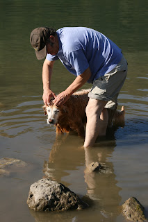 While Regal was having a great time swimming, there was this huge splash on the other side of the river... Janice with her trusty camera started shooting. To our great surprise an Osprey had dove into the water and caught a very large fish. This was a real treat.